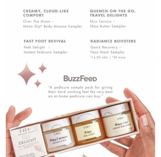 Includes their best-selling Honey Heel Glaze (Oprah's O-List foot serum made with date honey), lightweight Honey Lavender Sea Salt Polish, and Honey-Chai Steeped Milk Lotion (a gorgeous, spiced-milk infusion of organic coconut milk and sultry cardamom).